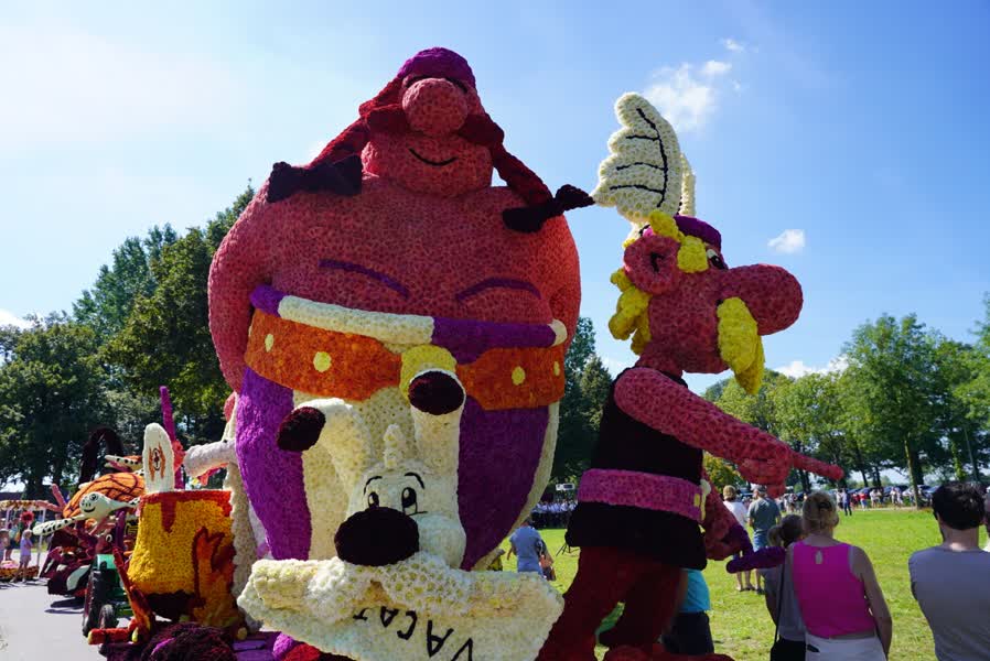 “Jong en oud maken dan samen een mega grote wagen, die dan hier vandaag in de optocht rondrijdt”, vertelt Maurice ten Barge van de organisatie. “Het leeft ontzettend en zeker naarmate het feest en de optocht dichterbij komt.” Wilbert Krooshof van corsogroep Koordershoek laat weten ongeveer een jaar lang bezig te zijn met de wagen. “In januari beginnen we met denken en komen er wat ideeën langs”, vertelt de bouwer. “Dan vanaf april of mei gaan we het uitwerken, tot nu het hoogtepunt.” De wagens hebben altijd een knipoog naar de actualiteit en zijn versierd met in totaal 1,2 miljoen kleurrijke dahlia’s.