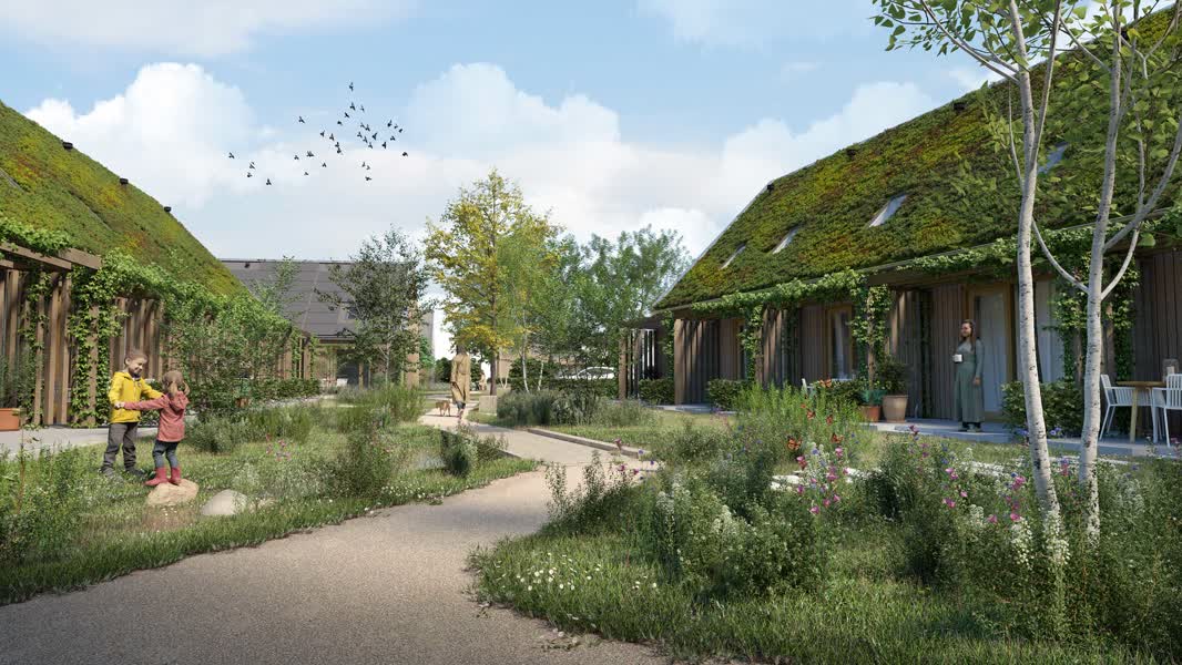 De woningen hebben allemaal een eigen terras, het gros van de ruimte rond de woningen is echter ingericht als gezamenlijk park. “Het is een soort community-achtige plaats, waar je bijvoorbeeld samen kunt barbecueën. Omdat starters vaak niet te tijd of zin hebben om in de tuin bezig te zijn, wordt dit ook onderhouden door de gemeente”, zegt Derksen. Vanwege het vele groen in het project én het groene karakter van de huizen heet het geheel ‘Gewoon groen Didam’. De huizen zijn gasloos, er zijn voldoende zonnepanelen, een aantal groene daken, ze zijn van hout en er wordt gebruik gemaakt van bio-based isolatie.