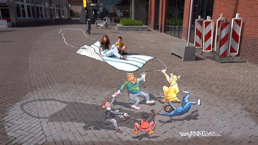 Na drie dagen hard werken zijn de 3D-kunstwerken sinds zondag opengesteld voor het publiek. “De linten zijn weggehaald, dus iedereen kan in de kunstwerken plaatsnemen”, laat van Kessel weten. "Je kan balanceren, surfen, duwen, trekken, liggen, alles kan in de kunst. De kunstwerken zien er op sommige plekken een beetje gek uit, omdat het in 2D op straat ligt. Maar als je dan door een lens kijkt, dan snap je het effect.” De kunstwerken blijven nog tot 31 oktober 2021 in de binnenstad liggen.