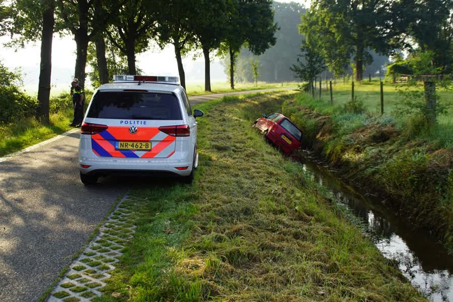 De auto wordt door de autoriteiten uit de sloot gehaald en veilig gesteld. Het is niet bekend of de eigenaar van het voertuig ook de bestuurder was.