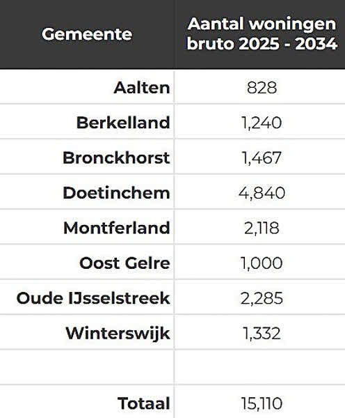 “Wij plannen vijf tot tien jaar vooruit en hebben alle gemeenten in de Achterhoek gevraagd hun plannen tot 2035 inzichtelijk te maken: welke grond ze aankopen, wat ze al in bezit hebben en welke afspraken er zijn met initiatiefnemers”, legt voorzitter van de Thematafel Wonen & Vastgoed Arjen van Gijssel uit. “Als je dat optelt, ontstaat er een duidelijk beeld dat we kunnen vastleggen in een nieuwe woondeal. Daarmee laten we richting het Rijk zien dat we veel meer kunnen bouwen dan eerder gedacht – niet 8.000, maar ruim 15.000 woningen tot 2035.”