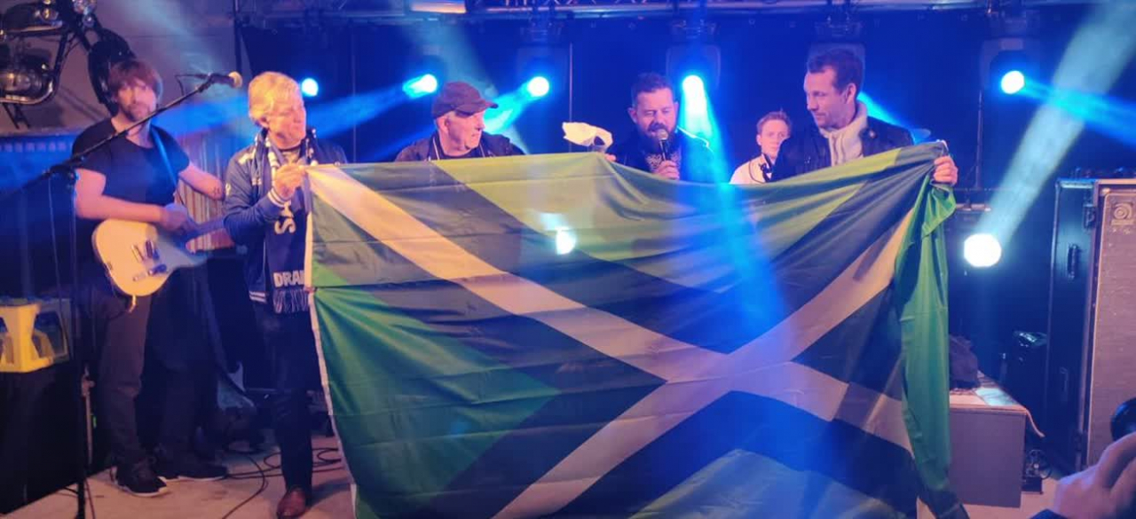 “Dat vind ik heel mooi”, aldus voorzitter Hans Boesberg van de supportersvereniging. “We hebben een schitterende vlag met de skyline van Doetinchem, we hebben de vlag van De Graafschap en nu komt de Achterhoekse vlag erbij.” De