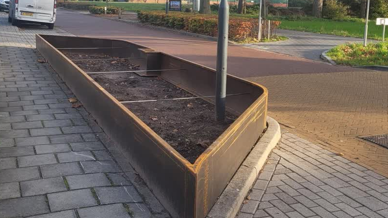 Twaalf cortenstalen bloembakken in Haarlo die als doel hebben om het verkeer minder hard te laten ri...