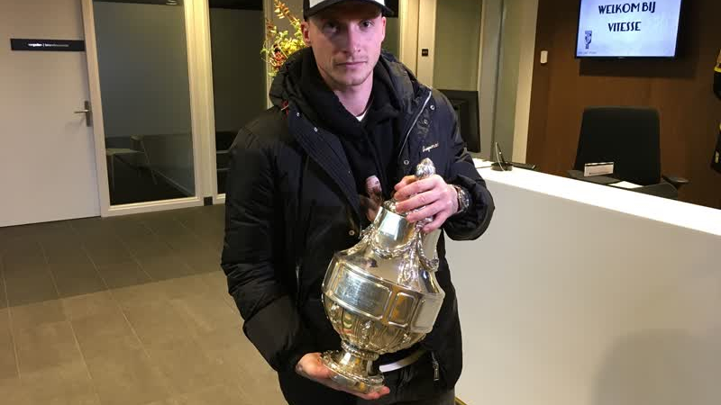 Supporters van De Graafschap kunnen donderdagmiddag poseren met de KNVB Beker op het Marktplein in D...