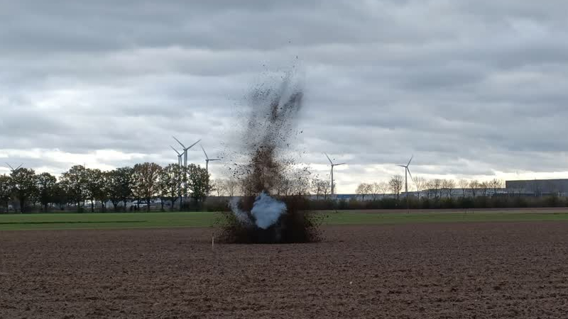Een Engelse brisantgranaat is dinsdagmiddag tot ontploffing gebracht in een weiland nabij Lengel. He...