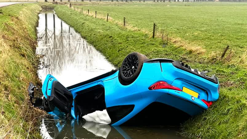 Een automobilist is woensdagmiddag met zijn auto op de kop in een sloot in het buitengebied van Gend...