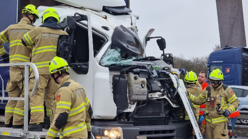 Op de snelweg A12 zijn ter hoogte van Zevenaar twee vrachtwagens op elkaar gebotst. De ravage is gro...
