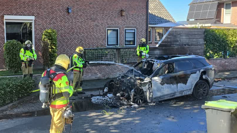 Een hybride auto met een Duits kenteken is dinsdagmiddag volledig uitgebrand op straat in Vragender....