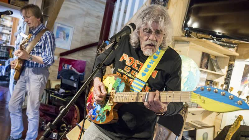 Met zijn welbekende grijns laat hij zijn nieuwste aanwinst zien: een gitaar in de vorm van een schil...