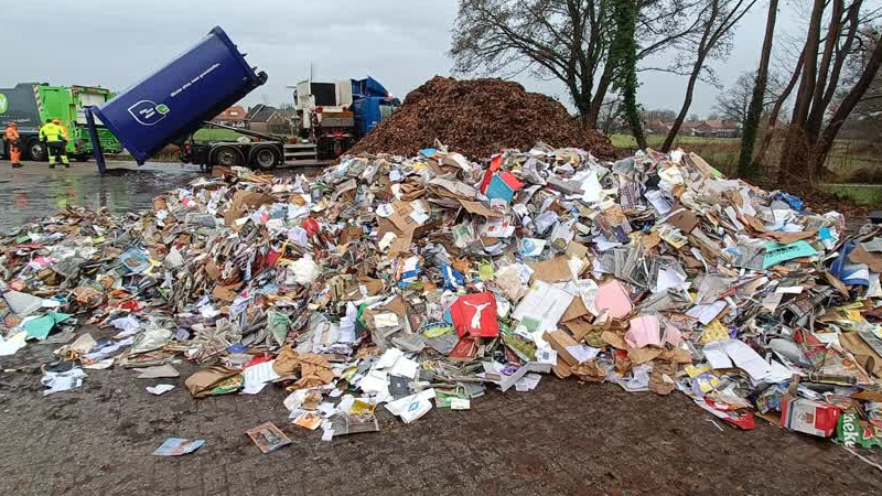 In een vuilniswagen met oud papier is dinsdagochtend brand ontstaan door accu's die tussen het mater...