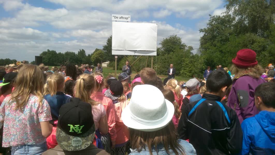 De laatste slingers en ballonnen worden nog snel opgehangen door de leerlingen van groep 8. Dan is b...