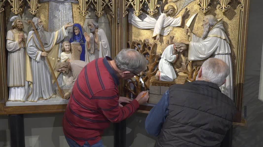 "Ik ben er een klein jaartje mee druk geweest", zegt vrijwilliger Antoon Gerritsen, die samen met Jan Thus druk bezig is geweest met het opknappen van de historische kerkstukken. "Dag en nacht is teveel gezegd, maar ik heb er bijna elke dag wat tijd aan besteed." Het restaureren van de bijzondere stukken uit 1924 bleek een grotere klus dan gedacht. "Het was best lastig omdat de beelden allemaal verschillende kleuren hebben", verklaart Gerritsen. "Ik heb ze eerst helemaal schoongemaakt, maar toen bleek de verf op de stukken los te laten. Daarom moest ik alle beelden en afbeeldingen helemaal opnieuw schilderen. Er zat houtworm in en dat heb ik behandeld." Gerritsen vindt het mooi voor de gemeenschap dat de altaarluiken een nieuwe plek krijgen in de Gaanderense kerk: "Dat doet de mensen toch wel wat denk ik. Ik hoop dat mensen uit Terborg de stap zetten om hier eens te komen kijken. Het is toch altijd lastig als er een kerk sluit."