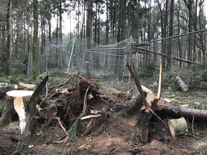 ‘’Zo erg als dit, heb ik het hier nog niet meegemaakt. We hebben behoorlijk wat schade opgelopen door de storm. Er zijn een hele boel bomen op de hekken van de verblijven van de lynxen, wolven en bruine beren terecht gekomen’’, vertelt verzorger Patrick Rutjes. ‘’We zijn erg druk geweest om de hekken vrij te krijgen en te voorkomen dat de dieren zouden ontsnappen. Maar alle dieren zijn ongedeerd en in hun verblijf gebleven.’’