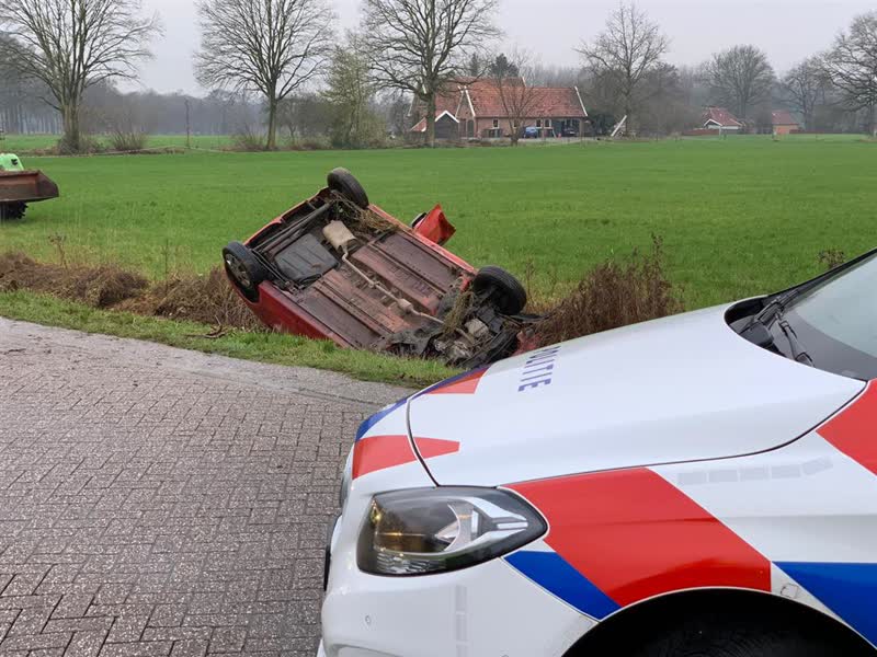 Een auto is dinsdagmiddag op zijn kop in een sloot terechtgekomen in Doetinchem. Geen van de inzittenden is gewond geraakt bij het eenzijdige ongeval.