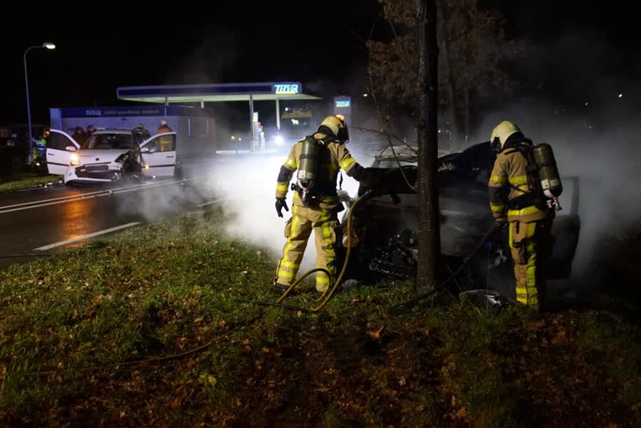 Bij een botsing tussen twee voertuigen op de rondweg rond Hengelo is vrijdagavond een auto in brand gevlogen. Er vielen drie gewonden.