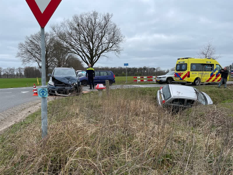 Bij een ongeluk nabij Eibergen is een voertuig in de greppel terecht gekomen. De botsing tussen twee auto's zorgde voor flinke schade aan beide voertuigen.