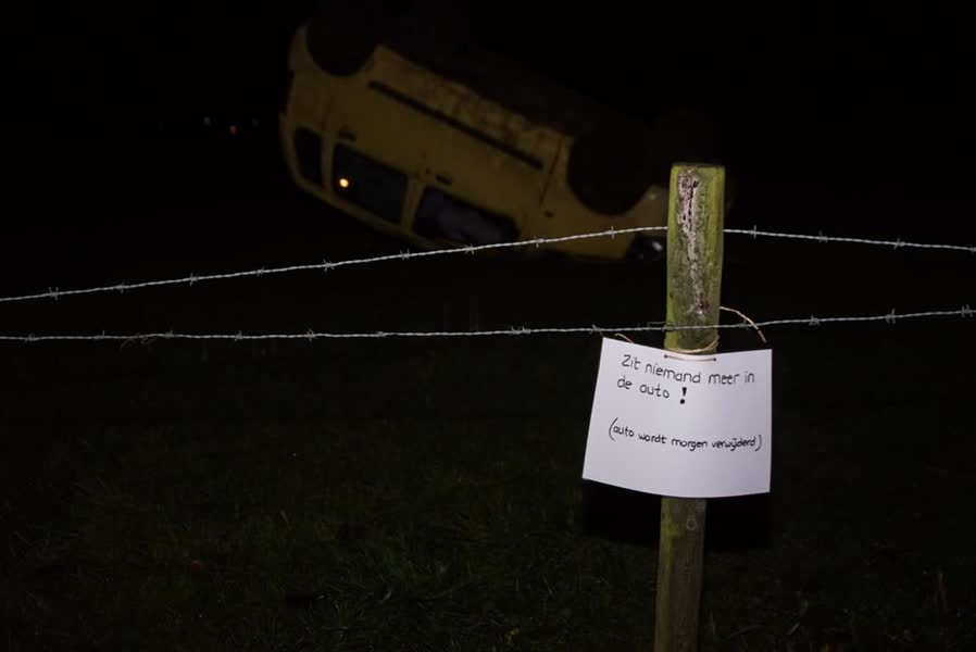 Het is niet bekend of er personen gewond zijn geraakt bij het incident. Wel is er op een afrasteringspaaltje een blaadje geplaatst met de tekst ‘Zit niemand meer in de auto! (auto wordt morgen verwijderd)’.