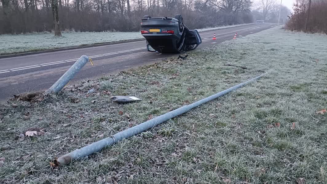 Het ongeval gebeurde rond 07.30 uur op de Plattenburgstraat. Een automobilist werd in een scherpe bocht verrast door de gladheid en verloor de macht over het stuur. De auto schoot van de weg af en ramde een lantaarnpaal. Door de klap sloeg het voertuig over de kop en eindigde op zijn dak.