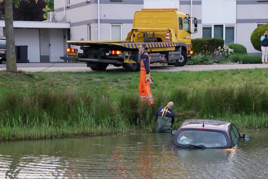 De auto rolde rond 20.30 uur vanuit een oprit het water in aan de Kruizemuntveld op De Huet. De eigenaar was na het parkeren van de auto vergeten de handrem aan te trekken. Een afsleepdienst kwam ter plaatse en heeft met hulp van een buurtbewoner de auto met een sleepkabel uit het water gehaald.