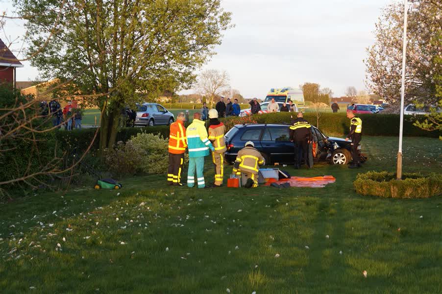 De bewoner die het gras aan het maaien was kon zich op tijd uit de voeten maken. De bestuurder is door de hulpdiensten uit de auto bevrijdt. In de auto zaten ook een vrouw en kind, zij kwamen met de schrik vrij. De auto moest zwaar beschadigd worden afgesleept.