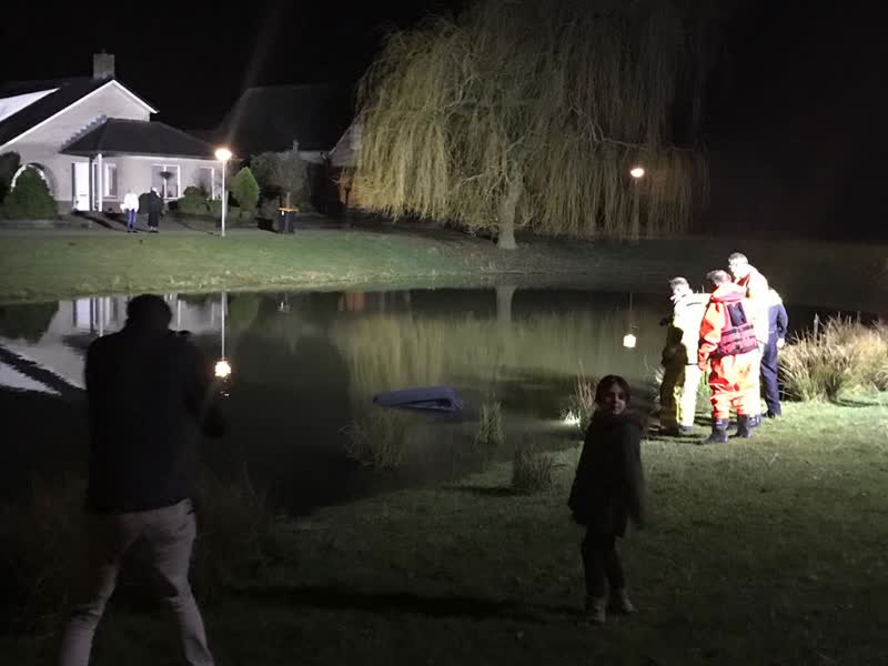 De auto is vrijwel geheel onder het wateroppervlakte verdwenen. De brandweer is opgeroepen om het voertuig uit het water te krijgen.