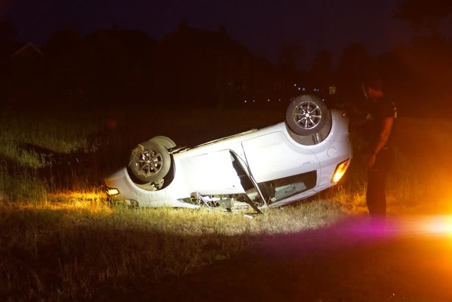 Een auto is vrijdagavond over de kop geslagen na een aanrijding op een kruising nabij Westendorp. Mogelijk is een voorrangsfout de oorzaak van het ongeluk.