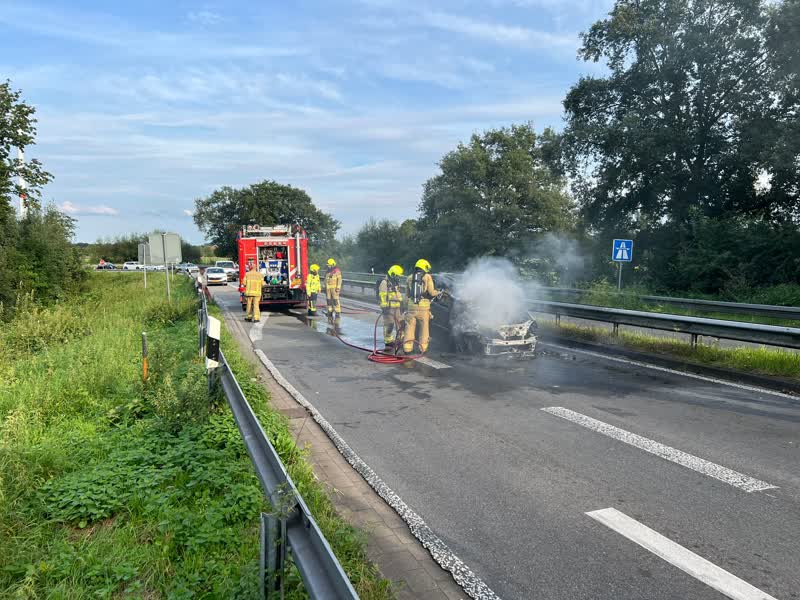 Een auto is zaterdagavond in brand gevlogen op de afrit van de Duitse snelweg A3 op de afrit naar Emmerik. Zowel de Nederlandse als de Duitse brandweer kwam ter plaatse.