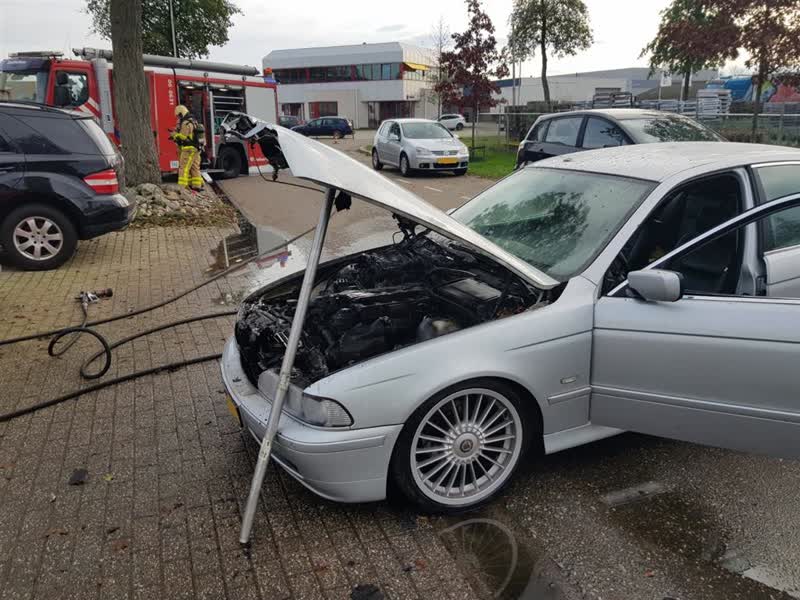 Een monteur heeft rook ingeademd en moest ter controle naar de huisartsenpost. De auto heeft aan de voorkant aanzienlijke schade opgelopen.