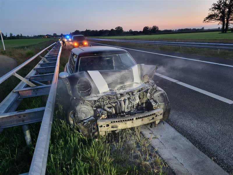 Een automobiliste is maandag op de vangrail ingereden langs de weg tussen Eibergen en Neede. Na de botsing vloog het voertuig in brand, de vrouw kwam zelf met de schrik vrij.