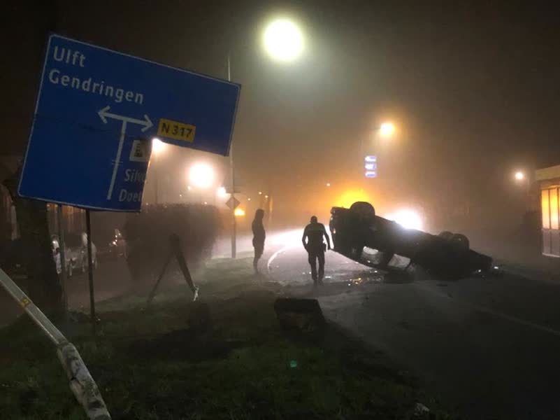 De bestuurder reed rond 23.30 uur over de N317 vanuit Dinxperlo richting Ulft toen het door onbekende oorzaak misging. Hij raakte van de weg af, ramde een lantaarnpaal en een verkeersbord en reed een betonblok uit de grond. Uiteindelijk kwam het voertuig op het dak midden op de weg tot stilstand.