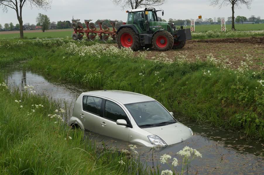 Ambulancepersoneel heeft het slachtoffer nagekeken en besloten haar niet mee te nemen naar het ziekenhuis. De auto moet uit het water worden getakeld.