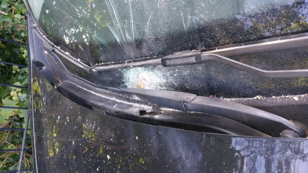 In de voorruit van de auto zit ter hoogte van de motorkap een grote ster van enkele centimeters doorsnee die uitlopers heeft over de hele voorruit. Daardoor moet de hele ruit vervangen worden.