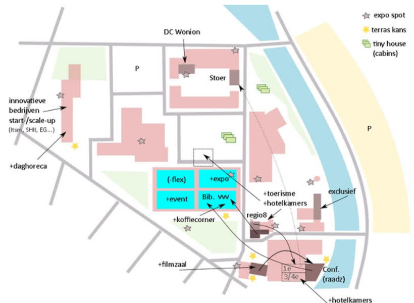 De vrijgekomen ruimte in het Loonbureau, waar nu REGIO8 gevestigd zit, wordt in de toekomst mogelijk benut als hotel. In 2026 begint een pilot met hotelkamers op de derde en vierde verdieping van het Portiersgebouw. “Deze locatie biedt ons de kans om de vraag en capaciteit te testen, zonder dat we hoeven te investeren in kostbare nieuwbouw”, valt in het plan te lezen. In het plan is niets meer te lezen over de eyecatcher van een hotel boven op de SSP-Hal. “Ik wil daarnaast ook meer vormen van horeca op het park, meerdere terrasjes of koffietentjes bijvoorbeeld”, zegt Van der Wal.