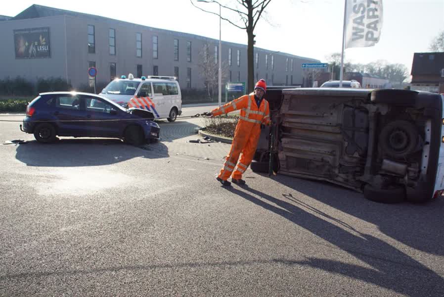 Het ongeluk gebeurde omstreeks 14.00 uur op het kruispunt van de Edisonstraat en de Dieselstraat. De bestuurder van het bedrijfsbusje wilde vanuit de Edisonstraat oversteken richting de Dieselstraat waarbij hij een tegemoetkomende auto over het hoofd zag. Bij de daaropvolgende aanrijding kwam het busje op de zijkant terecht.