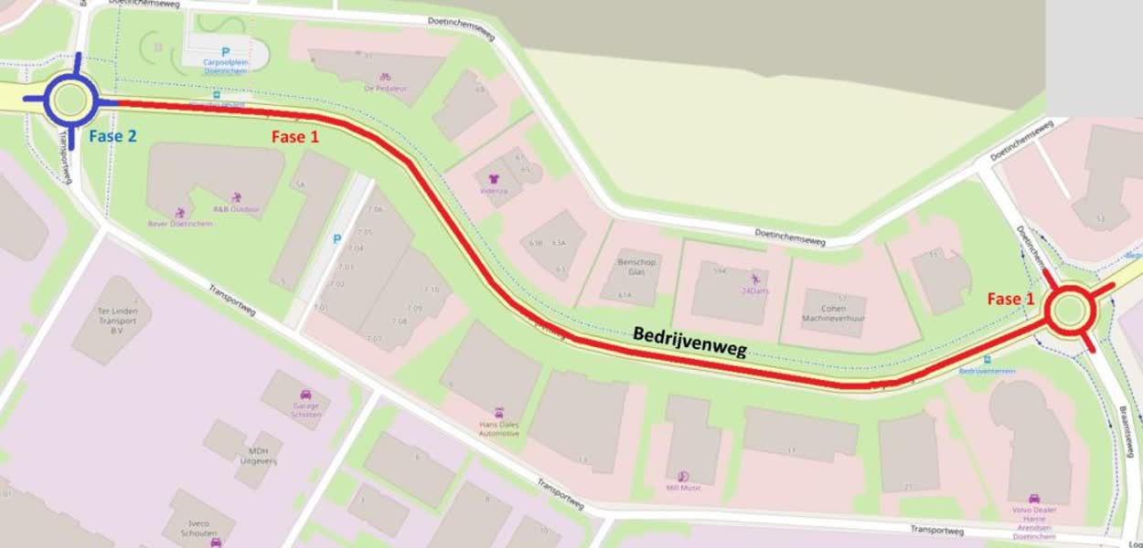 Vanaf maandag is een deel van de Bedrijvenweg in Doetinchem afgesloten vanwege werkzaamheden. Bij de werkzaamheden worden het asfalt en twee rotondes vernieuwd.