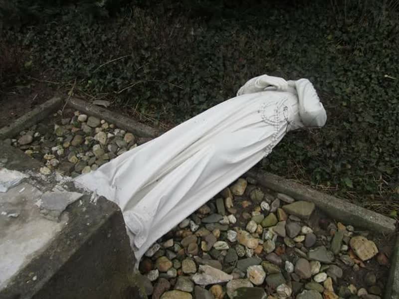 Het beeld stond bij het kapelletje in de tuin van het ouderencentrum aan de Benedendorpsstraat. Op foto’s is goed te zien dat het beeld van zijn sokkel is gerukt en in twee delen is gebroken.