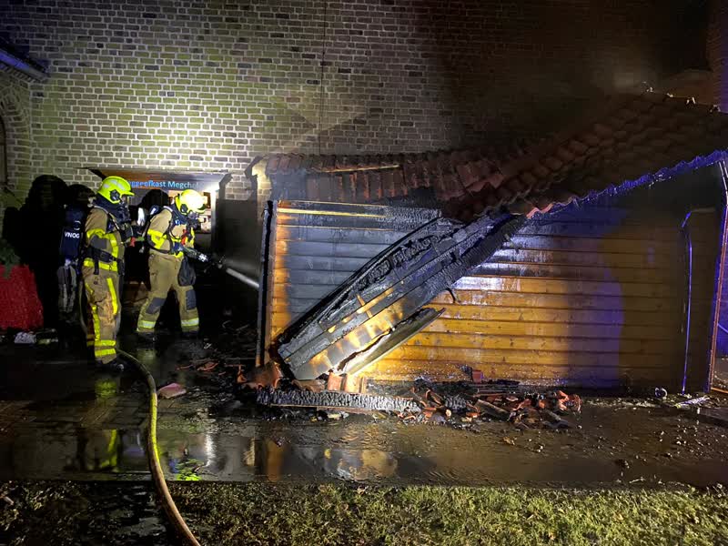 Een schuurtje waar tuinmachines en ander gereedschap lag opgeslagen bij de Sint-Martinuskerk in Megchelen is donderdagochtend in vlammen opgegaan. Een 79-jarige Duitser is aangehouden op verdenking van brandstichting.