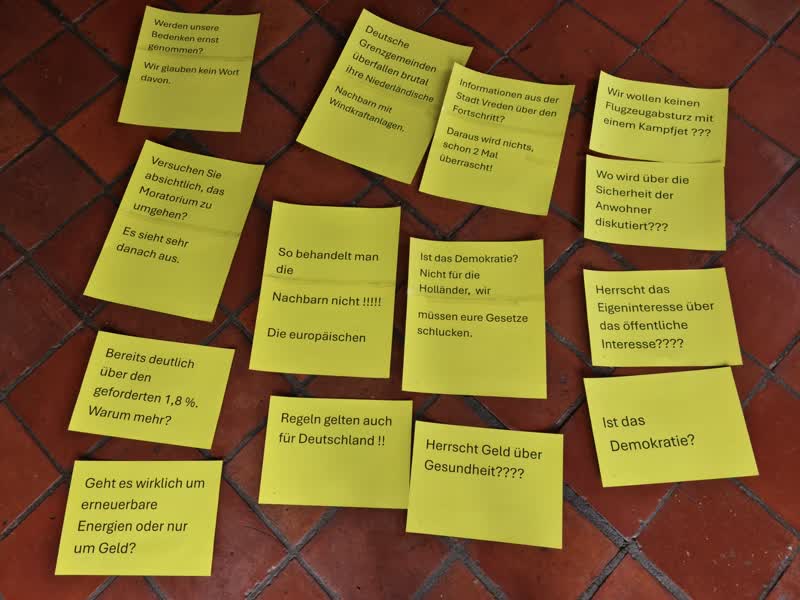 Het gaat over gebieden Vardingholt en Büngern in Rhede. En in Vreden over hoge windmolens die gepland staan nabij buurtschap Wennewick, Crossewick en Doemern-Höchte. Het laatstgenoemde plan verkeert het proces al in de ontwerpfase door de investeerder. Op de twee andere kunnen nog zienswijzen worden ingediend. “Wel naar gewicht”, meldde hoofd ruimtelijke ordening Diana Niestegge voorafgaand aan de raadsbijeenkomst. Het houdt in dat zienswijzen van Nederlandse kant weinig van invloed zijn als het Duitse recht spreekt. Dat zette een Rekkense inwoners aan tot een protest. Bij de raadszaal hielden zij pamfletten hoog met daarop ‘is dit democratie?’ en ‘zo behandel je je naaste buren niet’. Ondanks het protest is de beslissing doorgevoerd.