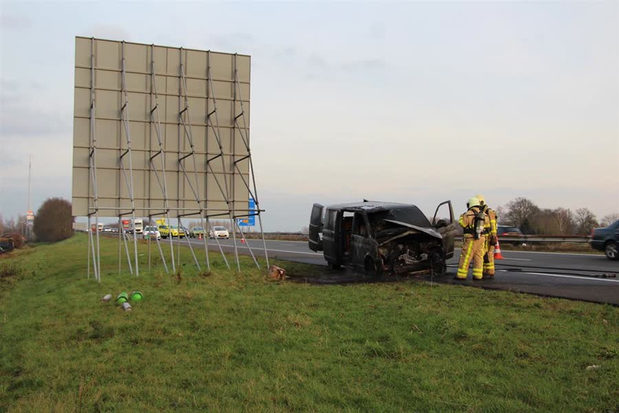 Een bestelbus is vrijdagavond op de vluchtstrook van de A18 uitgebrand. Het voertuig vatte midden in de avondspits vlam tussen afrit 3 en 4 bij Doetinchem.