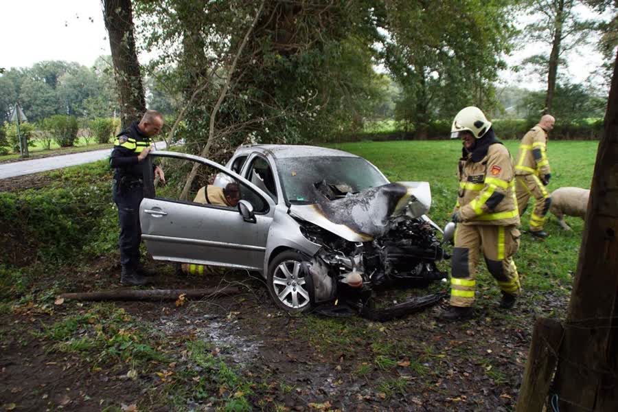 Het ongeval gebeurde omstreeks 12:00 uur op de Needse Tolweg in Geesteren. De bestuurder reed door nog onbekende oorzaak rechtdoor in een bocht, knalde op een boom en eindigde uiteindelijk in de berm. Zijn voertuig vloog daarbij in brand. Omstanders hebben uiteindelijk met hulp van aanwezige agenten de man uit de auto gekregen. Daarbij raakte een agent lichtgewond aan zijn hand.