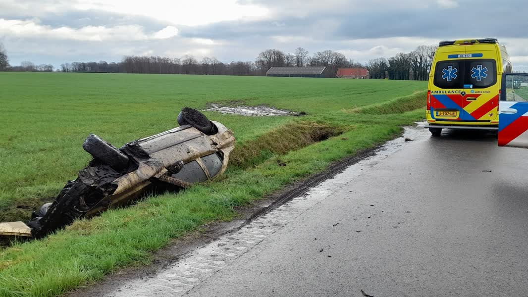 Een auto is zaterdagmiddag rond 14.15 uur is op de Varsseveldseweg (N330) bij Halle op de kop in de ...