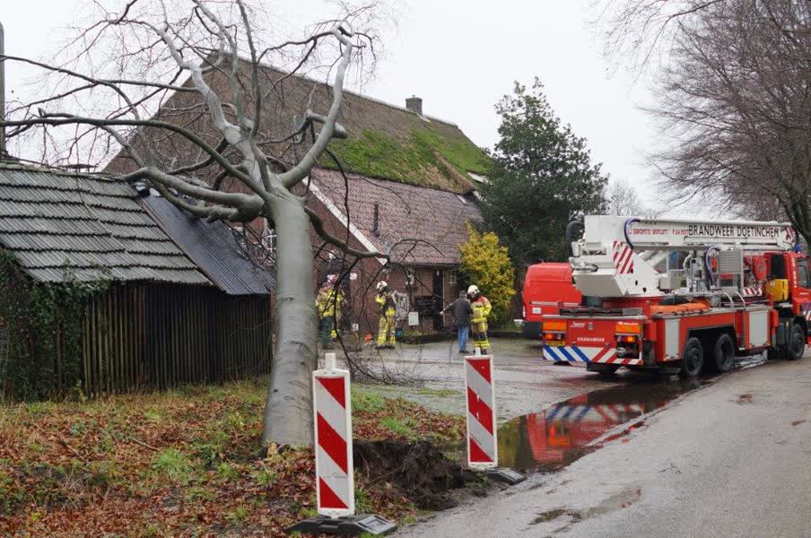 De boom is met behulp van een loonwerker en een hoogwerker van de Doetinchemse brandweer in stukken gezaagd.