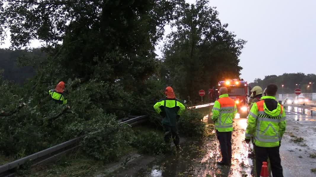 Een boom naast de A12 nabij Babberich heeft donderdagavond de storm die over Montferland trok niet volledig overleefd. Een deel knapte af en viel vervolgens op de afrit van de parkeerplaats.