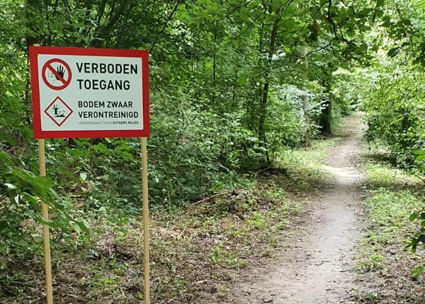 Op de borden is de tekst te lezen: 'Verboden toegang. Bodem zwaar verontreinigd. Veroorzaakt door: Rutgers Milieu'. “Ik heb zelf een grootschalig bodemonderzoek laten doen in het bos en deze blijkt zwaar vervuild te zijn”, zegt eigenaar Reinoud Arts. Het bos achter het terrein waar de vaten staan opgeslagen is eigendom van de gemeente. “Ik vind het mijn maatschappelijke verplichting dat ik iets doe", zegt Arts. "Ik snap dat de overheid niet op dit eigen initiatief zit te wachten, maar ze moeten zelf in actie komen.” Arts heeft de rapporten van het bodemonderzoek afgelopen woensdag doorgestuurd naar het waterschap en de gemeente, maar tot op heden heeft hij nog geen reactie van de partijen ontvangen.