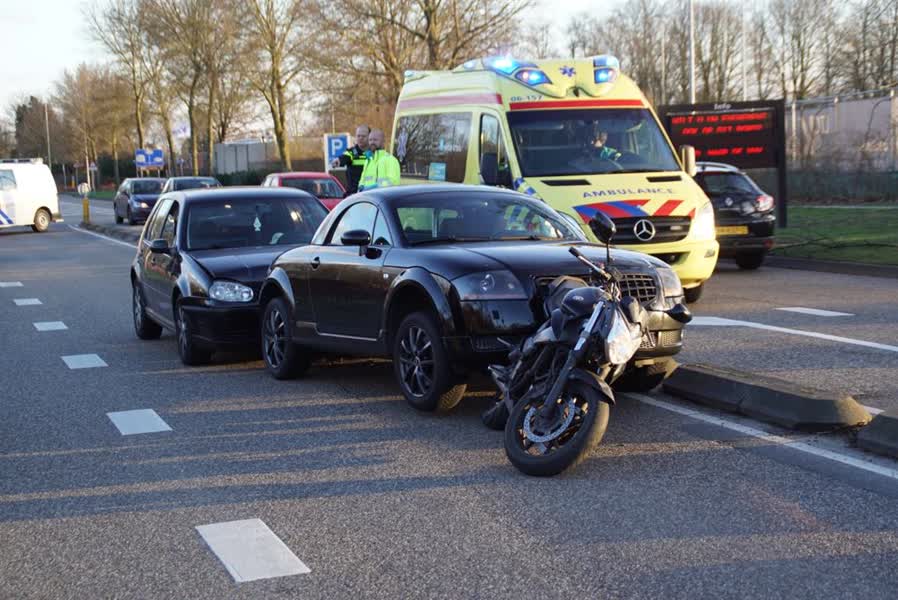 Het ongeval gebeurde rond 17.30 uur op het kruispunt van de Richterslaan met de N18. Een automobilist en de motorrijder stonden voor het stoplicht te wachten. Een achteropkomende bestuurder had dit niet in de gaten en ramde tegen de auto voor hem aan. Deze schoot vervolgens door tegen de motorrijder, waarbij de tweewieler vast kwam te zitten onder het voertuig.
