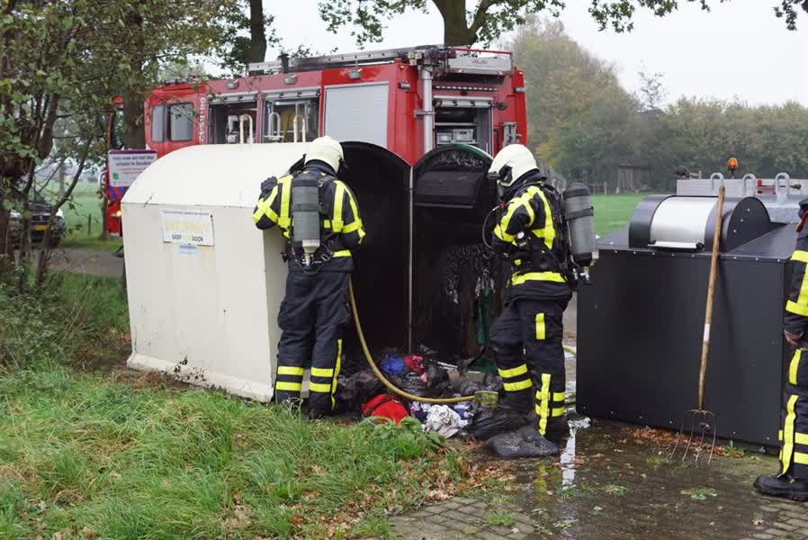 De plastic container is flink beschadigd en gesmolten door het vuur. Het is niet bekend hoe het vuur in de container in het buitengebied van Zelhem heeft kunnen ontstaan.