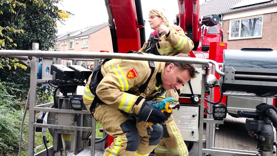 Brandweer haalt jonge papegaai Croky uit de boom in Doetinchem