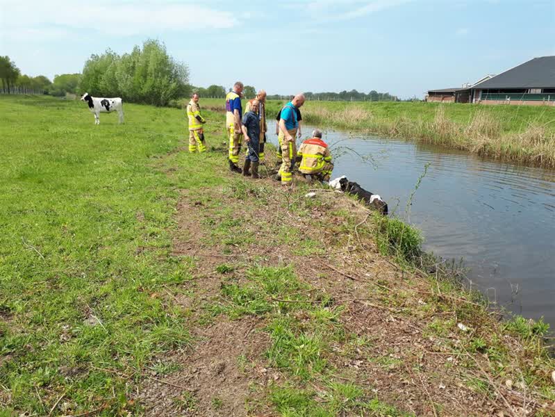 De brandweermannen hebben de koe het laatste zetje kunnen geven. Het beest is daardoor weer veilig op het droge terecht gekomen.