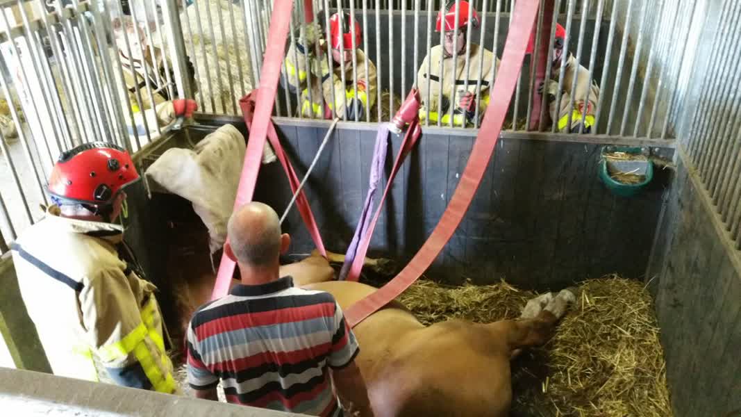 De brandweer probeerde uit alle macht het paard overeind te krijgen, maar uiteindelijk bleek het dier niet meer te redden. Met toestemming van de eigenaar is besloten het paard uit zijn lijden te verlossen.