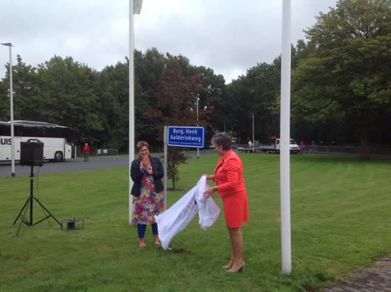 Wilma Aalderink, de weduwe van de voormalig burgemeester en waarneemster Helmi Huijbregts - Schiedon onthulden samen het bord van de rondweg, die langs het gemeentehuis van Bronckhorst loopt. De onthulling vormde de opening van de Kom d'r in dag, waarmee de gemeente haar 10-jarig bestaan viert.